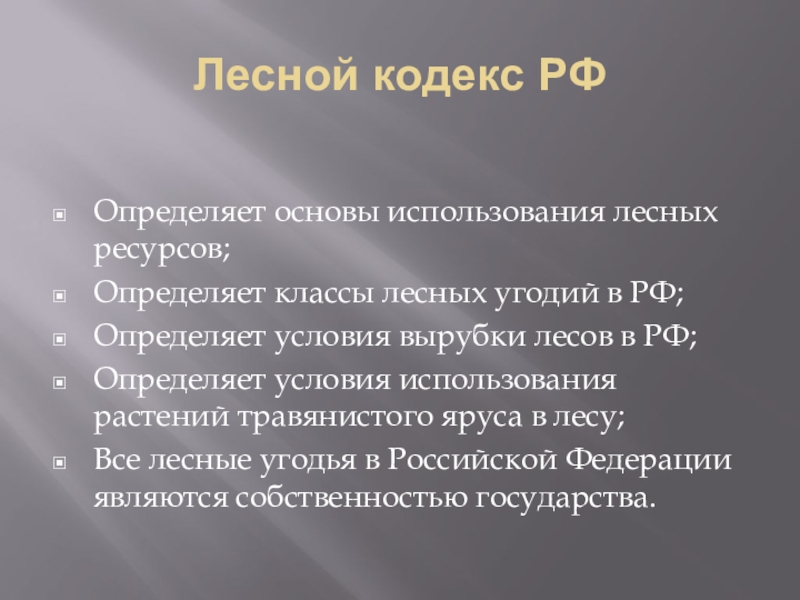 Лесной кодекс РФОпределяет основы использования лесных ресурсов;Определяет классы лесных угодий в РФ;Определяет условия вырубки лесов в РФ;Определяет
