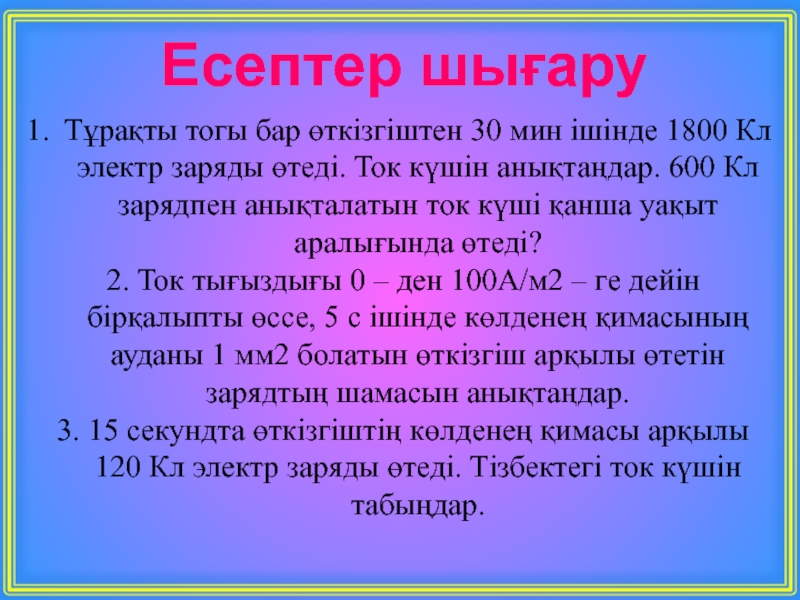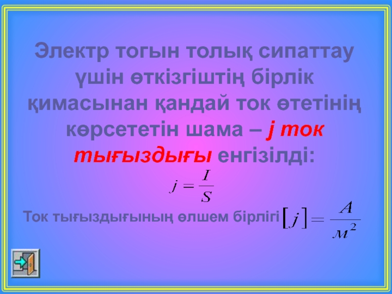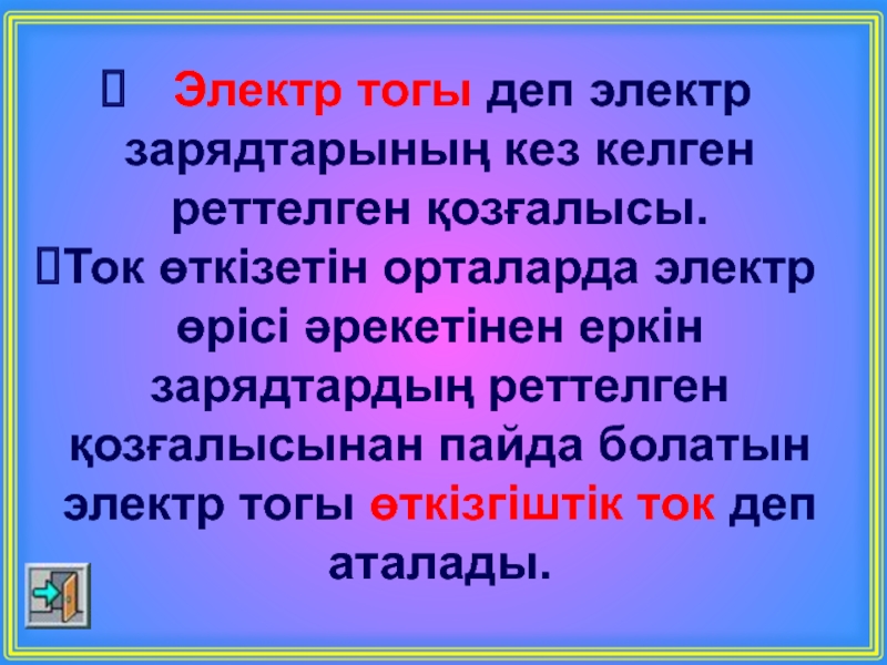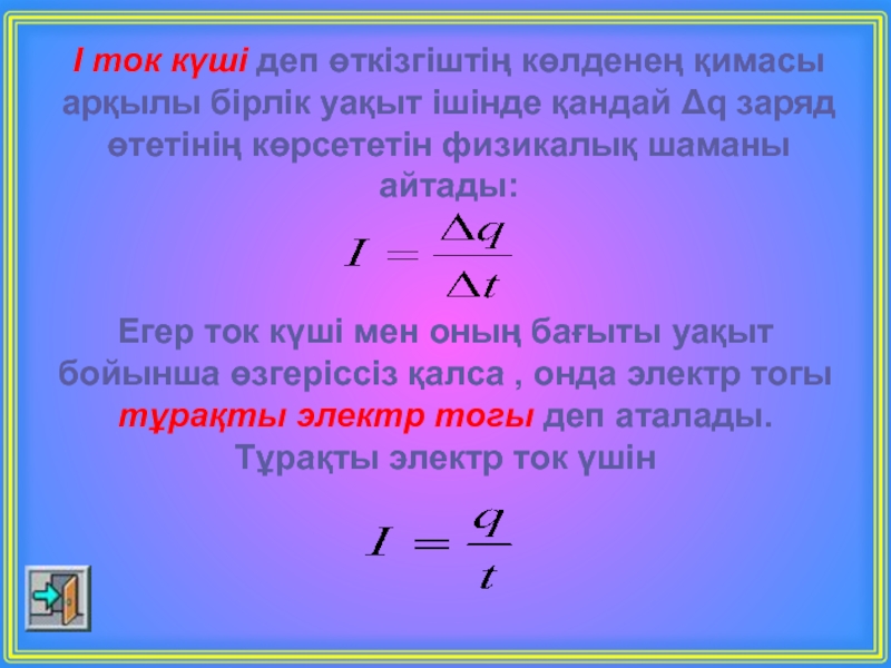 Егер ток күші мен оның бағыты уақыт бойынша өзгеріссіз қалса , онда электр тогы тұрақты электр тогы деп аталады. Тұрақты электр ток үшін