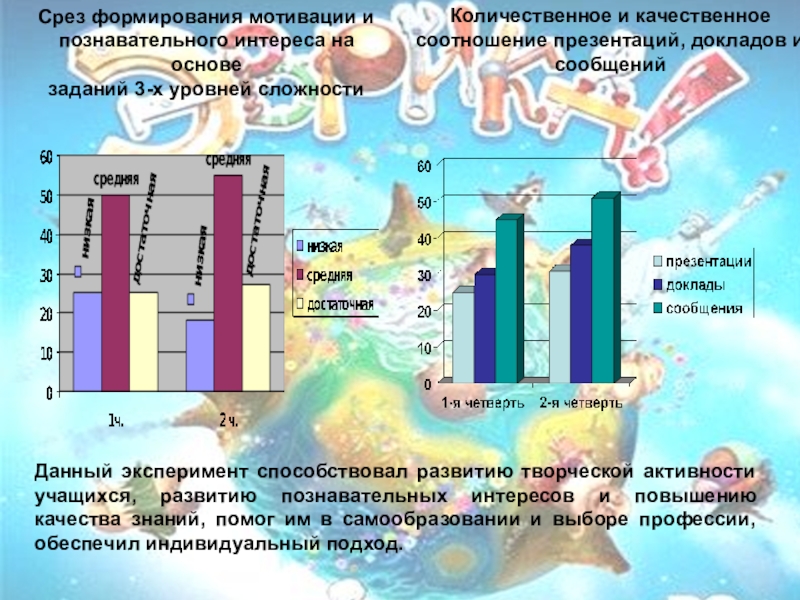 Данный эксперимент способствовал развитию творческой активности учащихся, развитию познавательных интересов и повышению качества знаний, помог им в самообразовании и выборе профессии, обеспечил индивидуальный подход.