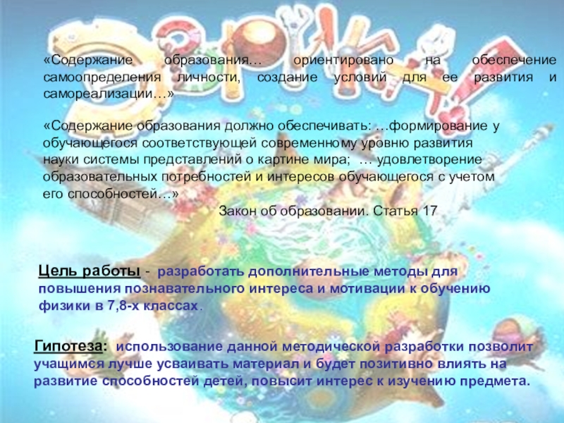 Цель работы - разработать дополнительные методы для повышения познавательного интереса и мотивации к обучению физики в 7,8-х классах.
