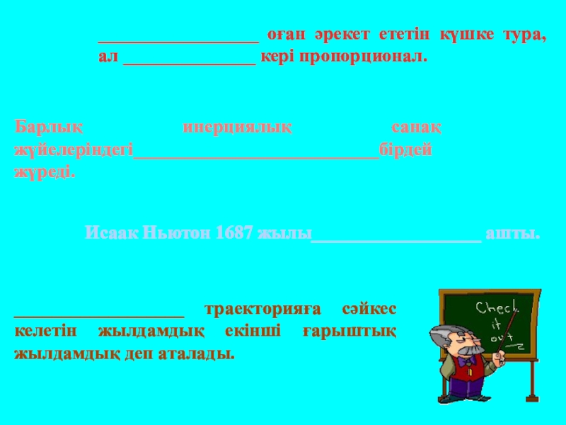 _________ – дененің басқа денелер тарапынан болатын әрекеттің нәтижесінде үдеу алатынын сипаттайтын физикалық шама.