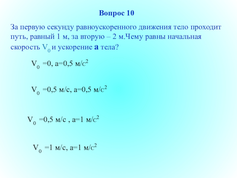 За первую секунду равноускоренного движения тело проходит путь, равный 1 м, за вторую – 2 м.Чему равны начальная скорость V0 и ускорение а тела?