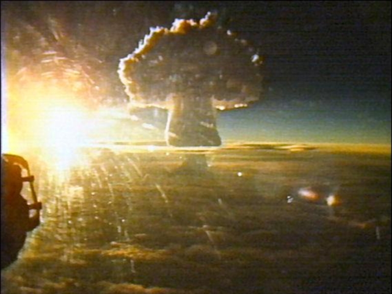 Эниветок. Первая в мире водородная бомба — советская РДС-6 была взорвана 12 августа 1953 года на полигоне в Семипалатинске . Устройство, испытанное США в 1952 году фактически не являлось «бомбой», а представляла собой лабораторный образец, «3-х этажный дом, наполненный жидким дейтерием», выполненный в виде специальной конструкции. Советские же ученые разработали именно бомбу — законченное устройство, пригодное к практическому применению.[2]. Впрочем, мощность взорванного американцами устройства составляла 10 мегатонн, в то время как мощность бомбы конструкции Сахарова — Лаврентьева[источник не указан 465 дней] — 400 килотонн. Самая крупная когда-либо взорванная водородная бомба — советская 50-мегатонная «царь-бомба», взорванная 30 октября 1961 года на полигоне архипелага Новая Земля. Никита Хрущёв впоследствии публично пошутил, что первоначально предполагалось взорвать 100-мегатонную бомбу, но заряд уменьшили, «чтобы не побить все стёкла в Москве». Конструктивно бомба действительно была рассчитана на 100 мегатонн и этой мощности можно было добиться заменой свинцового тампера на урановый[3]. Бомба была взорвана на высоте 4000 метров над полигоном «Новая Земля». Ударная волна после взрыва три раза обогнула земной шар. Несмотря на успешное испытание, бомба на вооружение не поступила[4]; тем не менее, создание и испытание сверхбомбы имели большое политическое значение, продемонстрировав, что СССР решил задачу достижения практически любого уровня мегатоннажа ядерного арсенала. Любопытно отметить, что после этого прекратился рост мегатоннажа ядерного арсенала США.