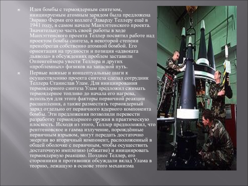 Ферми его коллеге Эдварду Теллеру ещё в 1941 году, в самом начале Манхэттенского проекта. Значительную часть своей работы в ходе Манхэттенского проекта Теллер посвятил работе над проектом бомбы синтеза, в некоторой степени пренебрегая собственно атомной бомбой. Его ориентация на трудности и позиция «адвоката дьявола» в обсуждениях проблем заставили Оппенгеймера увести Теллера и других «проблемных» физиков на запасной путь.