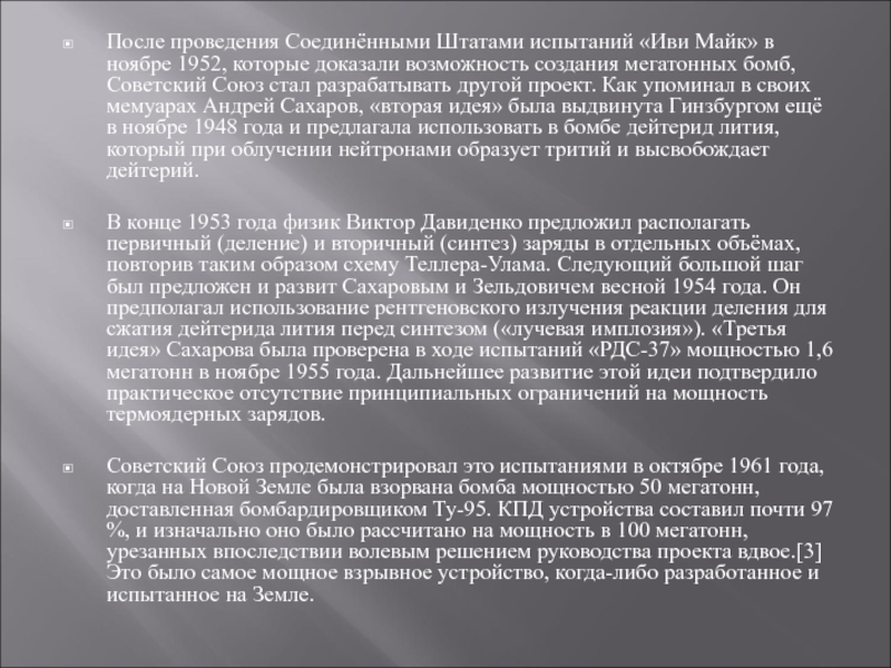 доказали возможность создания мегатонных бомб, Советский Союз стал разрабатывать другой проект. Как упоминал в своих мемуарах Андрей Сахаров, «вторая идея» была выдвинута Гинзбургом ещё в ноябре 1948 года и предлагала использовать в бомбе дейтерид лития, который при облучении нейтронами образует тритий и высвобождает дейтерий.