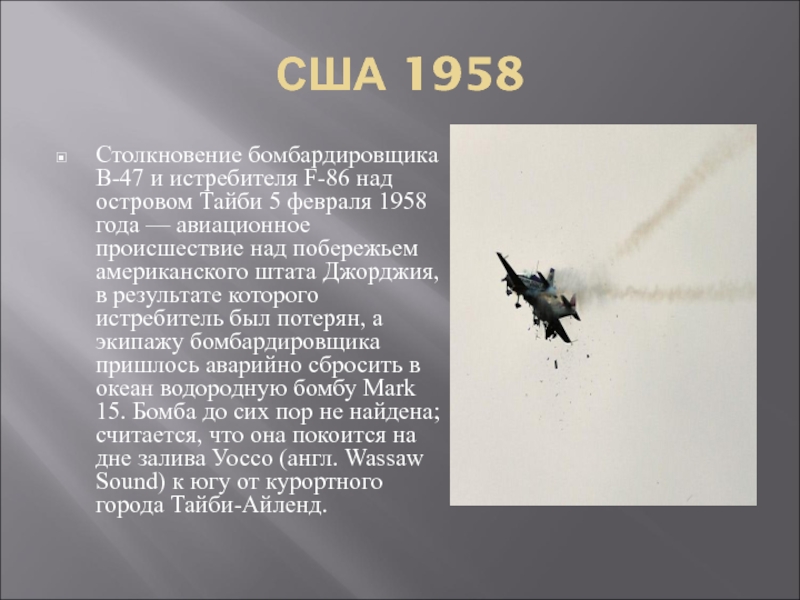 февраля 1958 года — авиационное происшествие над побережьем американского штата Джорджия, в результате которого истребитель был потерян, а экипажу бомбардировщика пришлось аварийно сбросить в океан водородную бомбу Mark 15. Бомба до сих пор не найдена; считается, что она покоится на дне залива Уоссо (англ. Wassaw Sound) к югу от курортного города Тайби-Айленд.