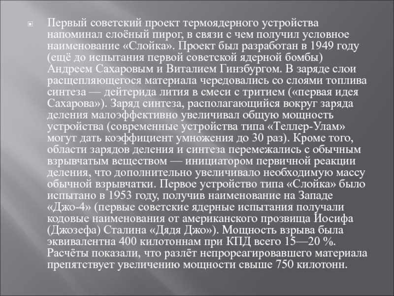 чем получил условное наименование «Слойка». Проект был разработан в 1949 году (ещё до испытания первой советской ядерной бомбы) Андреем Сахаровым и Виталием Гинзбургом. В заряде слои расщепляющегося материала чередовались со слоями топлива синтеза — дейтерида лития в смеси с тритием («первая идея Сахарова»). Заряд синтеза, располагающийся вокруг заряда деления малоэффективно увеличивал общую мощность устройства (современные устройства типа «Теллер-Улам» могут дать коэффициент умножения до 30 раз). Кроме того, области зарядов деления и синтеза перемежались с обычным взрывчатым веществом — инициатором первичной реакции деления, что дополнительно увеличивало необходимую массу обычной взрывчатки. Первое устройство типа «Слойка» было испытано в 1953 году, получив наименование на Западе «Джо-4» (первые советские ядерные испытания получали кодовые наименования от американского прозвища Иосифа (Джозефа) Сталина «Дядя Джо»). Мощность взрыва была эквивалентна 400 килотоннам при КПД всего 15—20 %. Расчёты показали, что разлёт непрореагировавшего материала препятствует увеличению мощности свыше 750 килотонн.