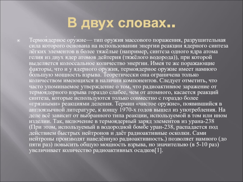 основана на использовании энергии реакции ядерного синтеза лёгких элементов в более тяжёлые (например, синтеза одного ядра атома гелия из двух ядер атомов дейтерия (тяжёлого водорода)), при которой выделяется колоссальное количество энергии. Имея те же поражающие факторы, что и у ядерного оружия, термоядерное оружие имеет намного бо́льшую мощность взрыва. Теоретически она ограничена только количеством имеющихся в наличии компонентов. Следует отметить, что часто упоминаемое утверждение о том, что радиоактивное заражение от термоядерного взрыва гораздо слабее, чем от атомного, касается реакций синтеза, которые используются только совместно с гораздо более «грязными» реакциями деления. Термин «чистое оружие», появившийся в англоязычной литературе, к концу 1970-х годов вышел из употребления. На деле всё зависит от выбранного типа реакции, используемой в том или ином изделии. Так, включение в термоядерный заряд элементов из урана-238 (При этом, используемый в водородной бомбе уран-238, распадается под действием быстрых нейтронов и даёт радиоактивные осколки. Сами нейтроны производят наведённую радиоактивность.) позволяет намного (до пяти раз) повысить общую мощность взрыва, но значительно (в 5-10 раз) увеличивает количество радиоактивных осадков[1].
