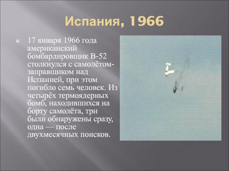 над Испанией, при этом погибло семь человек. Из четырёх термоядерных бомб, находившихся на борту самолёта, три были обнаружены сразу, одна — после двухмесячных поисков.