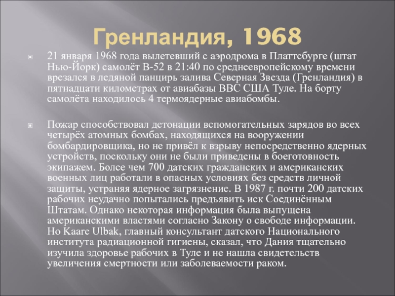 Нью-Йорк) самолёт B-52 в 21:40 по среднеевропейскому времени врезался в ледяной панцирь залива Северная Звезда (Гренландия) в пятнадцати километрах от авиабазы ВВС США Туле. На борту самолёта находилось 4 термоядерные авиабомбы.
