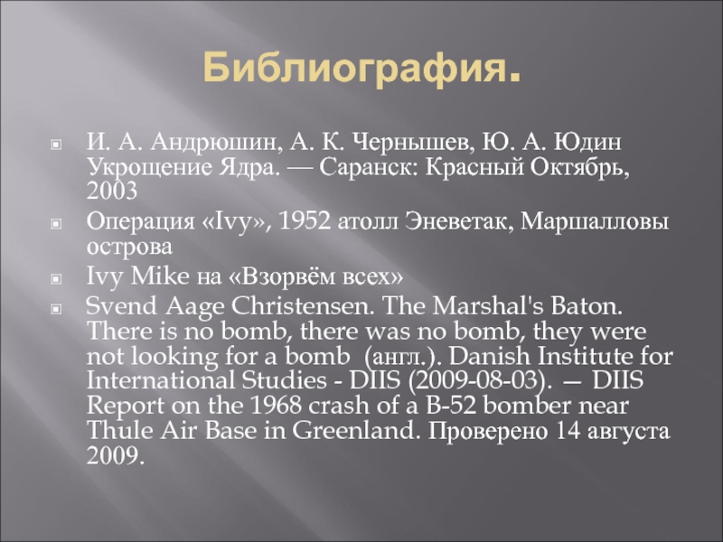 Svend Aage Christensen. The Marshal's Baton. There is no bomb, there was no bomb, they were not looking for a bomb (англ.). Danish Institute for International Studies - DIIS (2009-08-03). — DIIS Report on the 1968 crash of a B-52 bomber near Thule Air Base in Greenland. Проверено 14 августа 2009.