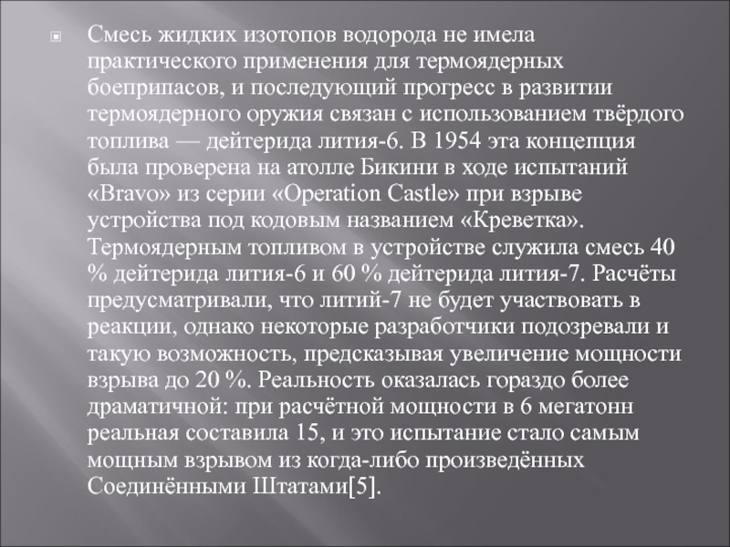 и последующий прогресс в развитии термоядерного оружия связан с использованием твёрдого топлива — дейтерида лития-6. В 1954 эта концепция была проверена на атолле Бикини в ходе испытаний «Bravo» из серии «Operation Castle» при взрыве устройства под кодовым названием «Креветка». Термоядерным топливом в устройстве служила смесь 40 % дейтерида лития-6 и 60 % дейтерида лития-7. Расчёты предусматривали, что литий-7 не будет участвовать в реакции, однако некоторые разработчики подозревали и такую возможность, предсказывая увеличение мощности взрыва до 20 %. Реальность оказалась гораздо более драматичной: при расчётной мощности в 6 мегатонн реальная составила 15, и это испытание стало самым мощным взрывом из когда-либо произведённых Соединёнными Штатами[5].