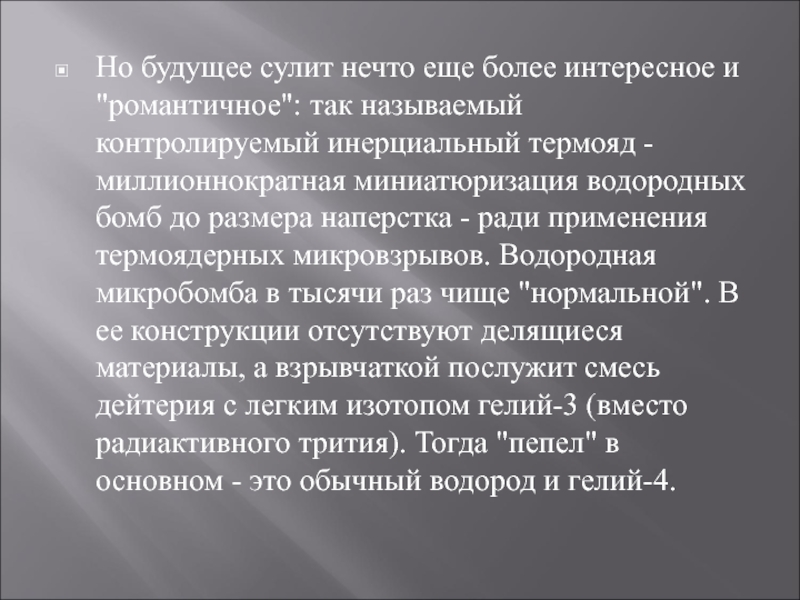 контролируемый инерциальный термояд - миллионнократная миниатюризация водородных бомб до размера наперстка - ради применения термоядерных микровзрывов. Водородная микробомба в тысячи раз чище "нормальной". В ее конструкции отсутствуют делящиеся материалы, а взрывчаткой послужит смесь дейтерия с легким изотопом гелий-3 (вместо радиактивного трития). Тогда "пепел" в основном - это обычный водород и гелий-4.