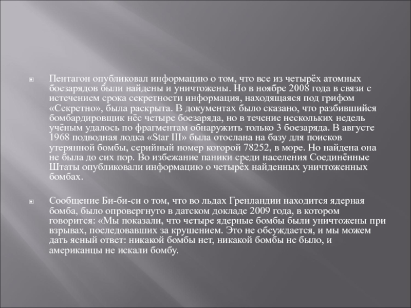 были найдены и уничтожены. Но в ноябре 2008 года в связи с истечением срока секретности информация, находящаяся под грифом «Секретно», была раскрыта. В документах было сказано, что разбившийся бомбардировщик нёс четыре боезаряда, но в течение нескольких недель учёным удалось по фрагментам обнаружить только 3 боезаряда. В августе 1968 подводная лодка «Star III» была отослана на базу для поисков утерянной бомбы, серийный номер которой 78252, в море. Но найдена она не была до сих пор. Во избежание паники среди населения Соединённые Штаты опубликовали информацию о четырёх найденных уничтоженных бомбах.