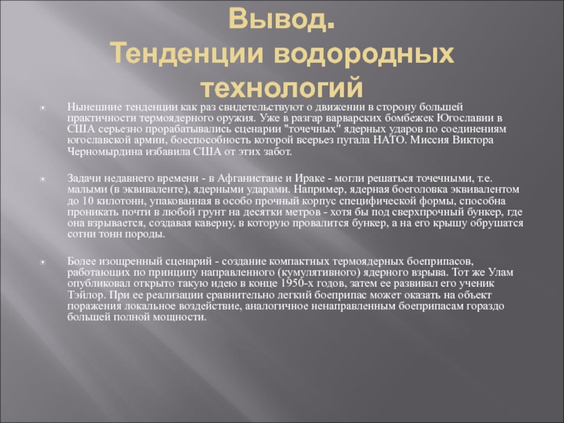 большей практичности термоядерного оружия. Уже в разгар варварских бомбежек Югославии в США серьезно прорабатывались сценарии "точечных" ядерных ударов по соединениям югославской армии, боеспособность которой всерьез пугала НАТО. Миссия Виктора Черномырдина избавила США от этих забот.
