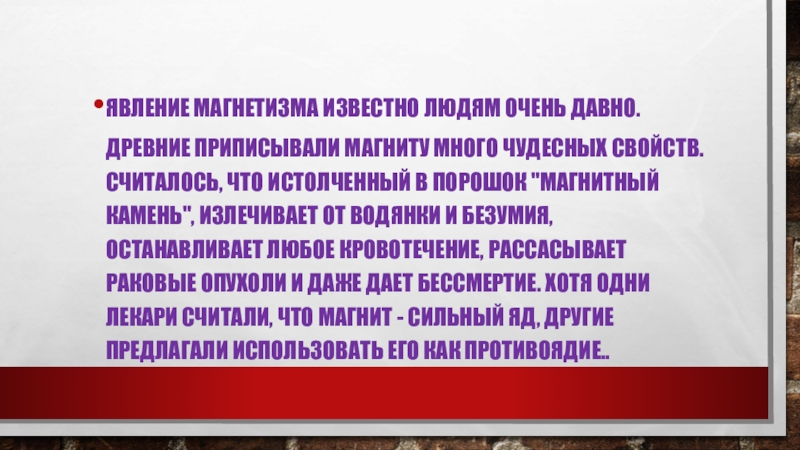 Магниты оказывают мягкое обезболивающее действие, улучшают настроение, лечат заболевания костей, уменьшает возбудимость нервной системы и снимает стресс.