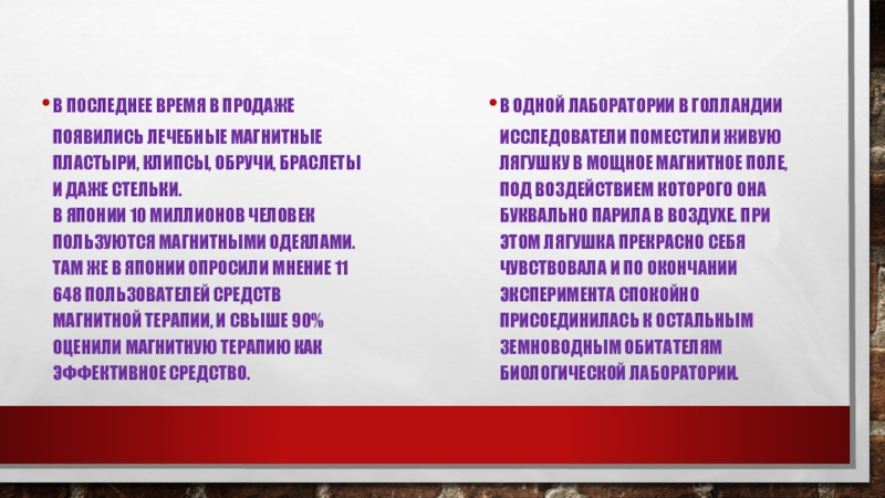 В одной лаборатории в Голландии исследователи поместили живую лягушку в мощное магнитное поле, под воздействием которого она буквально парила в воздухе. При этом лягушка прекрасно себя чувствовала и по окончании эксперимента спокойно присоединилась к остальным земноводным обитателям биологической лаборатории.