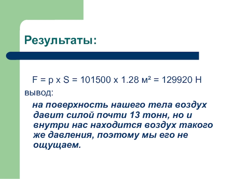Слайд 20определение силы давления атмосферы на свое тело