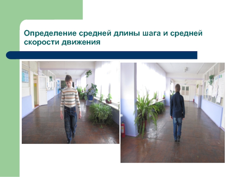Слайд 25Определение средней длины шага и средней скорости движения