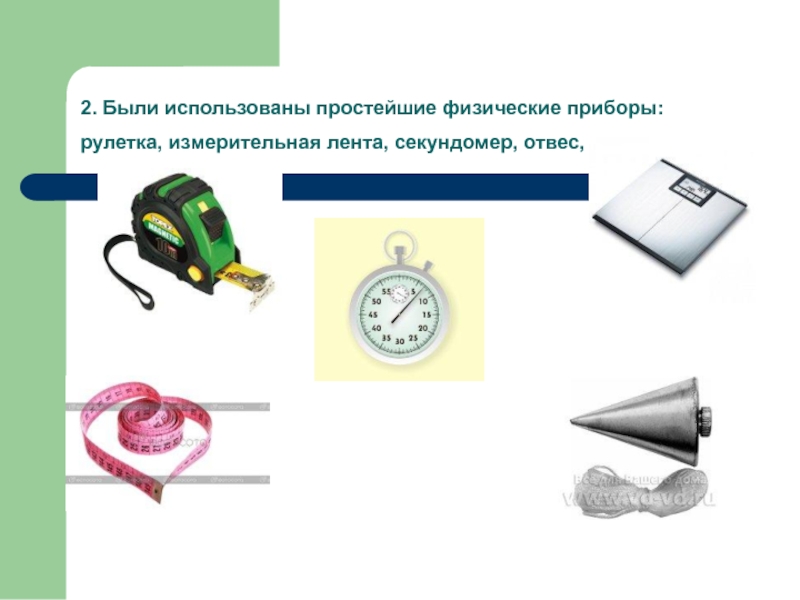 Слайд 62. Были использованы простейшие физические приборы: рулетка, измерительная лента, секундомер, отвес,