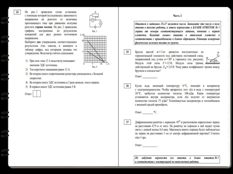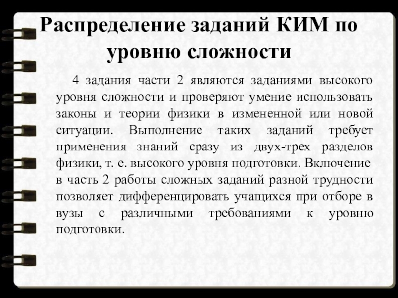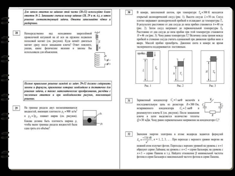 2 являются заданиями высокого уровня сложности и проверяют умение использовать законы и теории физики в измененной или новой ситуации. Выполнение таких заданий требует применения знаний сразу из двух-трех разделов физики, т. е. высокого уровня подготовки. Включение в часть 2 работы сложных заданий разной трудности позволяет дифференцировать учащихся при отборе в вузы с различными требованиями к уровню подготовки.