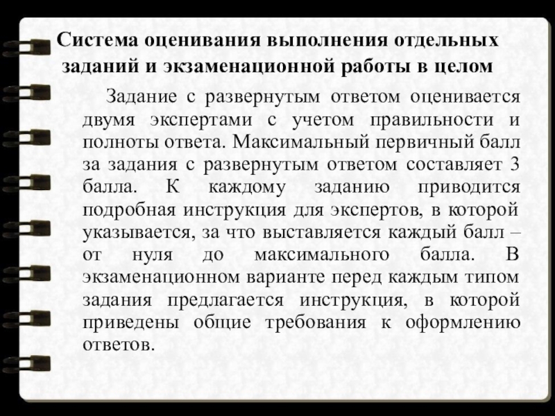 Задание с развернутым ответом оценивается двумя экспертами с учетом правильности и полноты ответа. Максимальный первичный балл за задания с развернутым ответом составляет 3 балла. К каждому заданию приводится подробная инструкция для экспертов, в которой указывается, за что выставляется каждый балл – от нуля до максимального балла. В экзаменационном варианте перед каждым типом задания предлагается инструкция, в которой приведены общие требования к оформлению ответов.