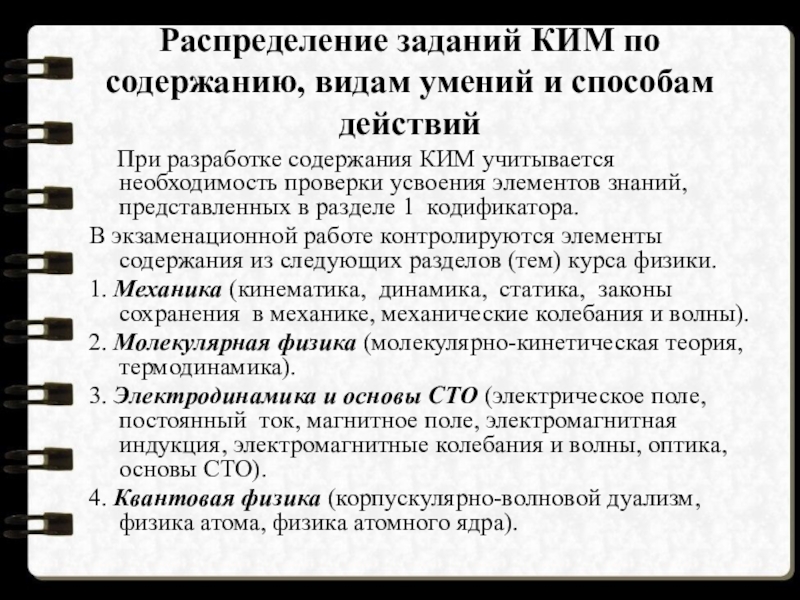 Слайд 8Распределение заданий КИМ по содержанию, видам умений и способам действий