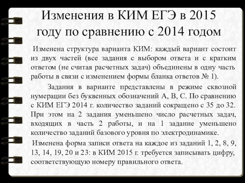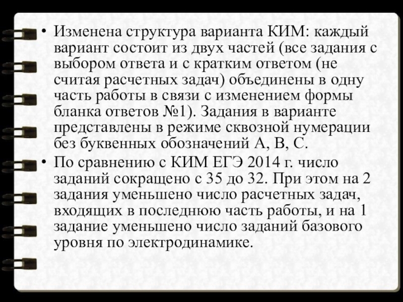 По сравнению с КИМ ЕГЭ 2014 г. число заданий сокращено с 35 до 32. При этом на 2 задания уменьшено число расчетных задач, входящих в последнюю часть работы, и на 1 задание уменьшено число заданий базового уровня по электродинамике.