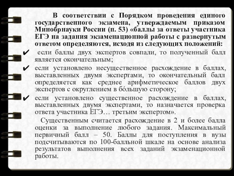 утверждаемым приказом Минобрнауки России (п. 53) «баллы за ответы участника ЕГЭ на задания экзаменационной работы с развернутым ответом определяются, исходя из следующих положений: