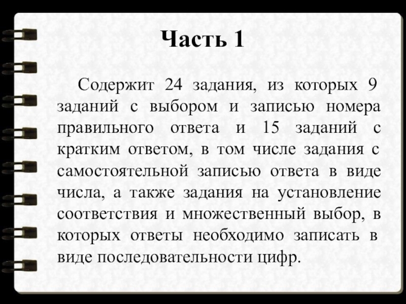 выбором и записью номера правильного ответа и 15 заданий с кратким ответом, в том числе задания с самостоятельной записью ответа в виде числа, а также задания на установление соответствия и множественный выбор, в которых ответы необходимо записать в виде последовательности цифр.