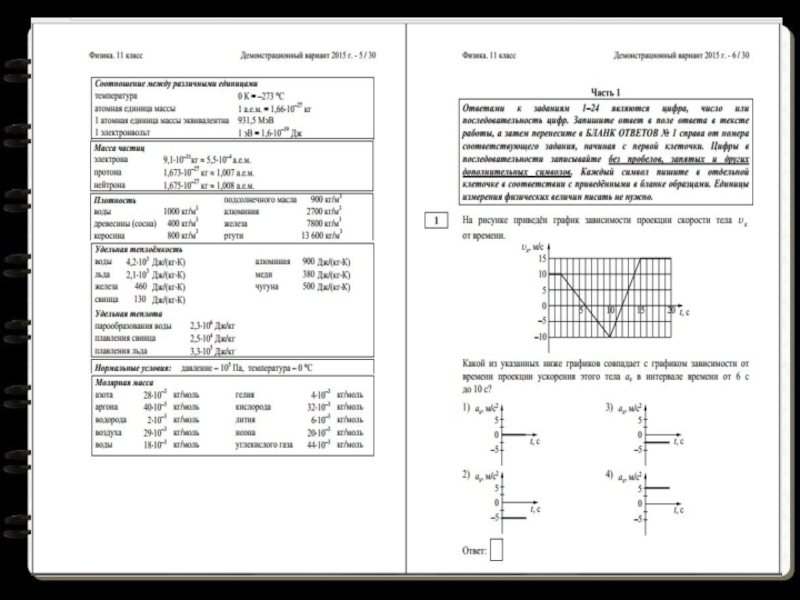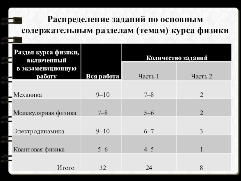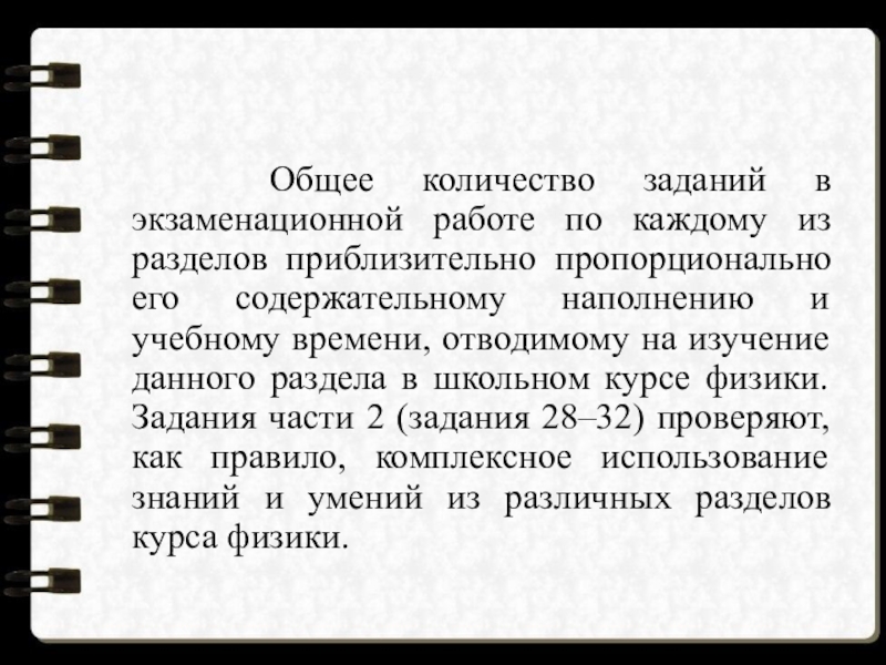 разделов приблизительно пропорционально его содержательному наполнению и учебному времени, отводимому на изучение данного раздела в школьном курсе физики. Задания части 2 (задания 28–32) проверяют, как правило, комплексное использование знаний и умений из различных разделов курса физики.