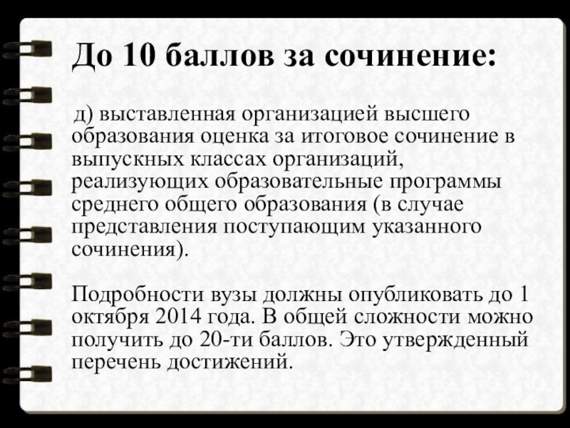 Подробности вузы должны опубликовать до 1 октября 2014 года. В общей сложности можно получить до 20-ти баллов. Это утвержденный перечень достижений.