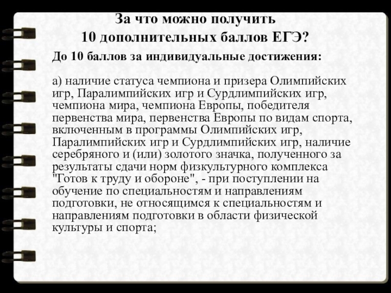 а) наличие статуса чемпиона и призера Олимпийских игр, Паралимпийских игр и Сурдлимпийских игр, чемпиона мира, чемпиона Европы, победителя первенства мира, первенства Европы по видам спорта, включенным в программы Олимпийских игр, Паралимпийских игр и Сурдлимпийских игр, наличие серебряного и (или) золотого значка, полученного за результаты сдачи норм физкультурного комплекса "Готов к труду и обороне", - при поступлении на обучение по специальностям и направлениям подготовки, не относящимся к специальностям и направлениям подготовки в области физической культуры и спорта;