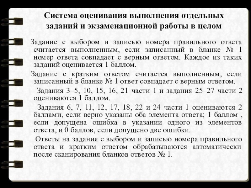 Слайд 15Система оценивания выполнения отдельных заданий и экзаменационной работы в целом