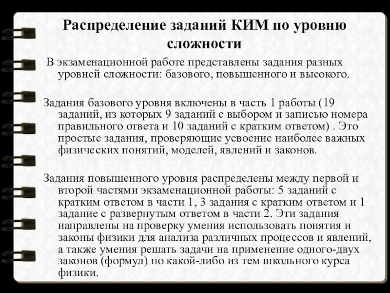 Задания повышенного уровня распределены между первой и второй частями экзаменационной работы: 5 заданий с кратким ответом в части 1, 3 задания с кратким ответом и 1 задание с развернутым ответом в части 2. Эти задания направлены на проверку умения использовать понятия и законы физики для анализа различных процессов и явлений, а также умения решать задачи на применение одного-двух законов (формул) по какой-либо из тем школьного курса физики.