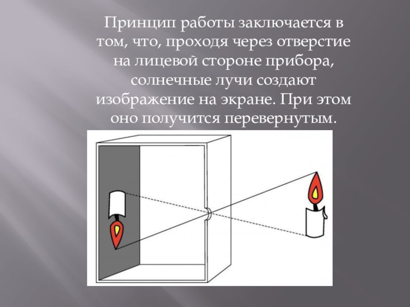 Принцип работы заключается в том, что, проходя через отверстие на лицевой стороне прибора, солнечные лучи создают изображение