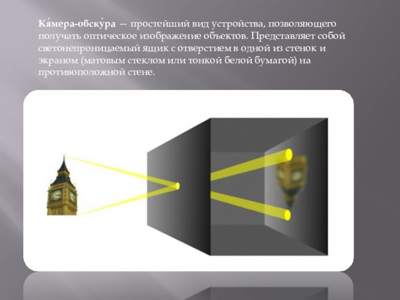 Слайд 2Ка́мера-обску́ра — простейший вид устройства, позволяющего получать оптическое изображение объектов. Представляет собой