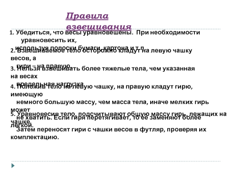 5. Уравновесив тело, подсчитывают общую массу гирь, лежащих на чашке.