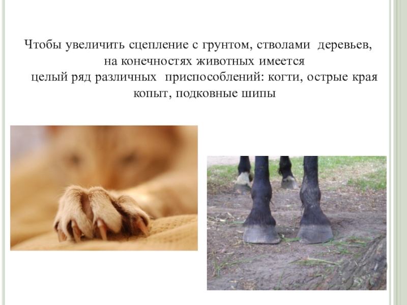 Слайд 13Чтобы увеличить сцепление с грунтом, стволами деревьев, на конечностях животных имеется