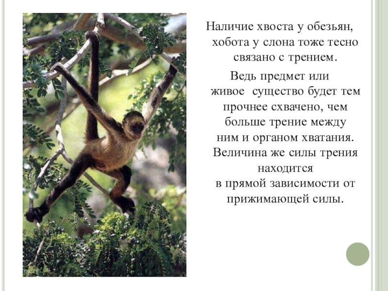 Слайд 15Наличие хвоста у обезьян, хобота у слона тоже тесно связано с трением.