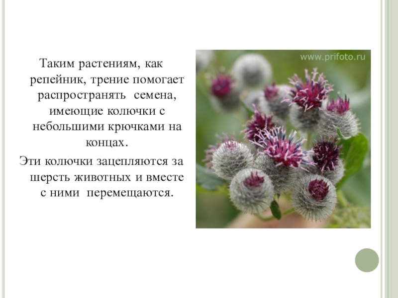 Слайд 6Таким растениям, как репейник, трение помогает распространять семена, имеющие колючки с