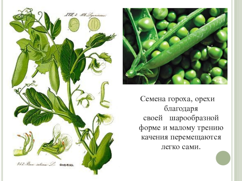 Слайд 7Семена гороха, орехи благодаря своей шарообразной форме и малому трению качения