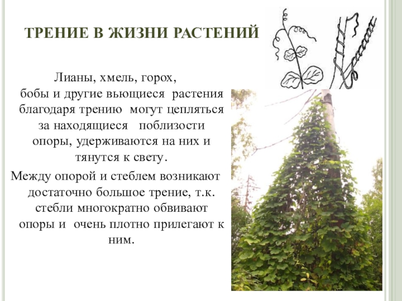 Между опорой и стеблем возникают достаточно большое трение, т.к. стебли многократно обвивают опоры и очень плотно прилегают к ним.