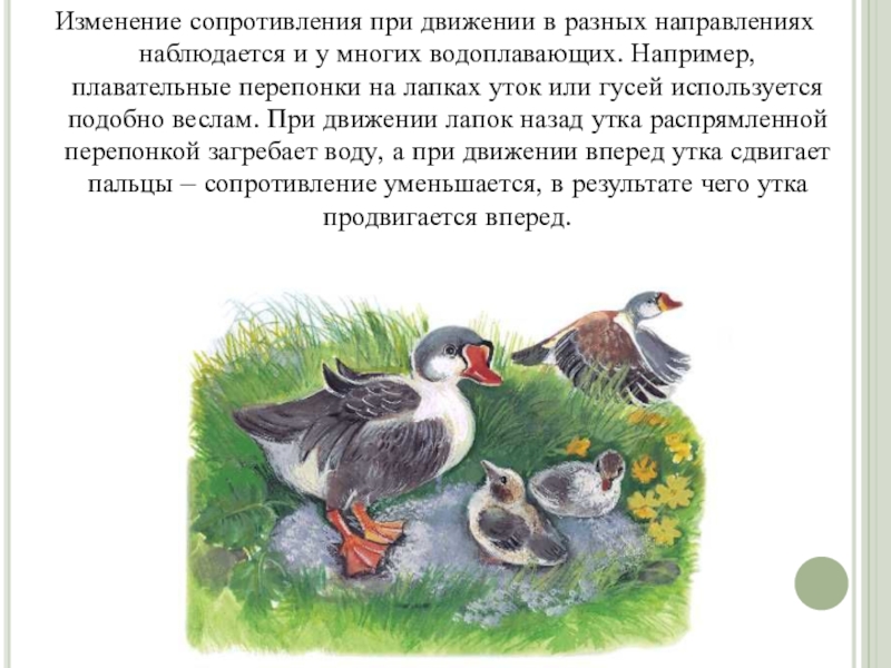 водоплавающих. Например, плавательные перепонки на лапках уток или гусей используется подобно веслам. При движении лапок назад утка распрямленной перепонкой загребает воду, а при движении вперед утка сдвигает пальцы – сопротивление уменьшается, в результате чего утка продвигается вперед.