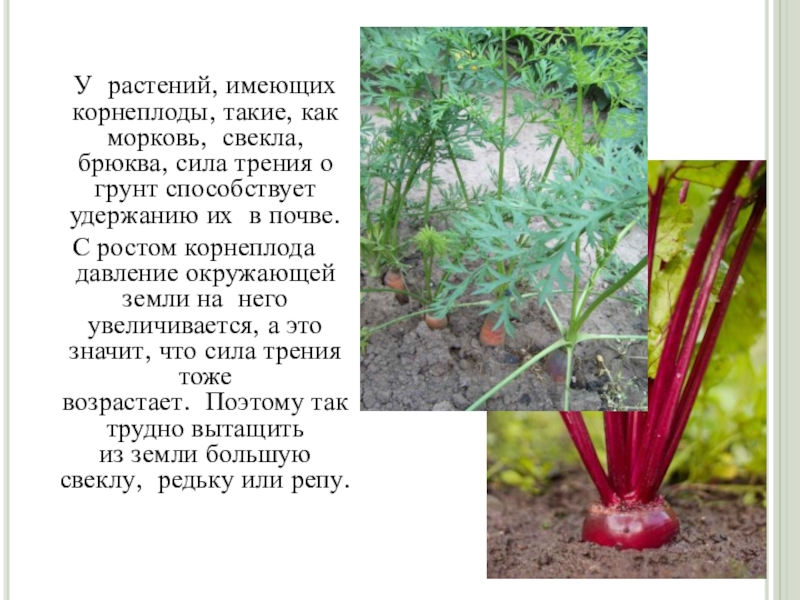 У растений, имеющих корнеплоды, такие, как морковь, свекла, брюква, сила трения