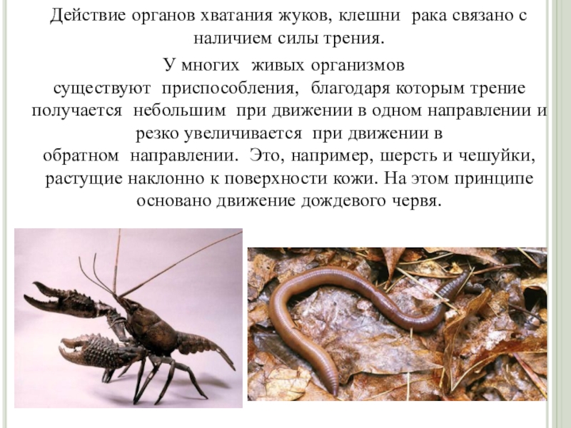 У многих живых организмов существуют приспособления, благодаря которым трение получается небольшим при движении в одном направлении и резко увеличивается при движении в обратном направлении. Это, например, шерсть и чешуйки, растущие наклонно к поверхности кожи. На этом принципе основано движение дождевого червя.