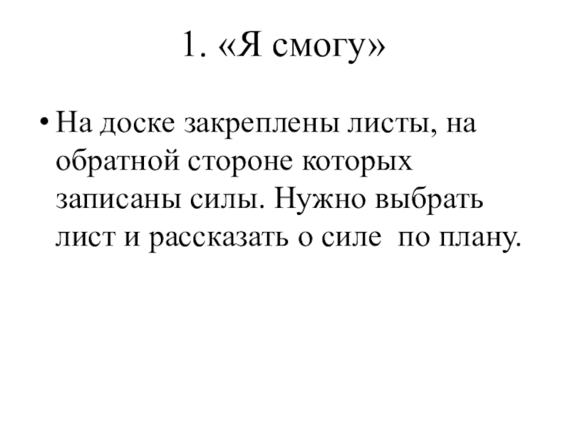 1. «Я смогу»На доске закреплены листы, на обратной стороне которых записаны силы. Нужно выбрать лист и рассказать