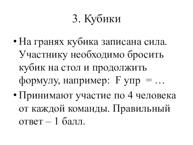 3. КубикиНа гранях кубика записана сила. Участнику необходимо бросить кубик на стол и продолжить формулу, например: F