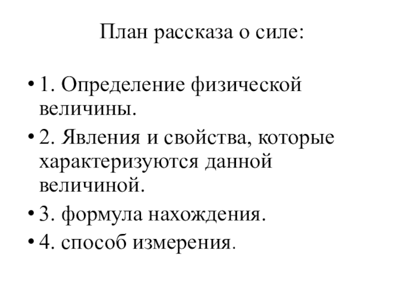 План рассказа о силе: 1. Определение физической величины.2. Явления и свойства, которые характеризуются данной величиной.3. формула нахождения.4.