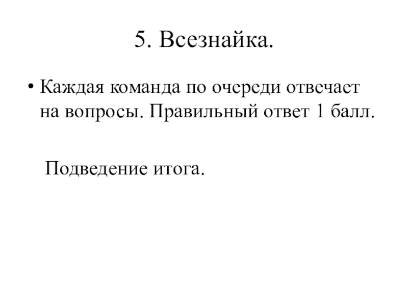 5. Всезнайка.Каждая команда по очереди отвечает на вопросы. Правильный ответ 1 балл.  Подведение итога.